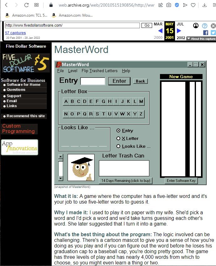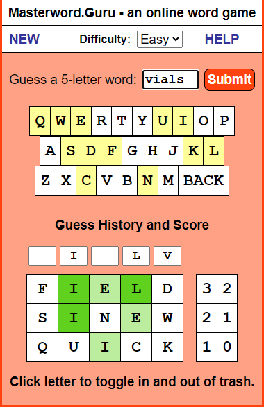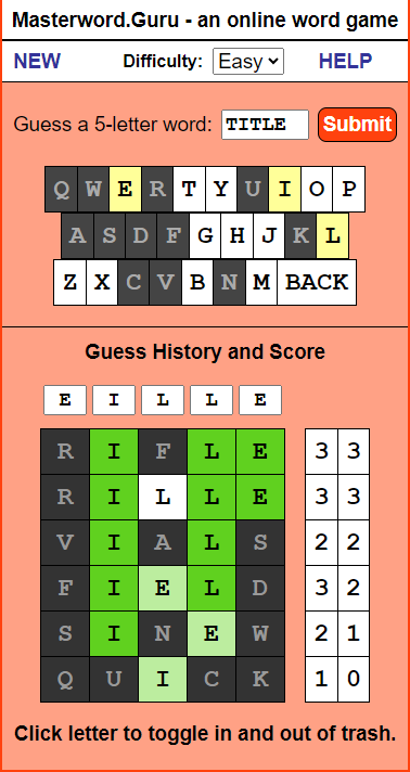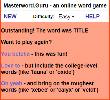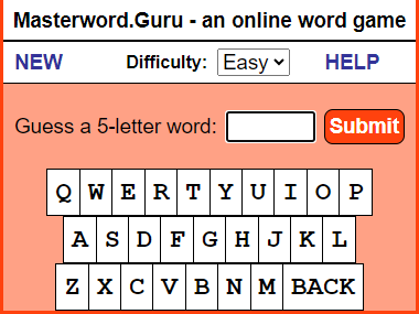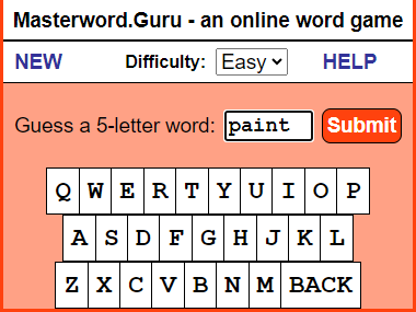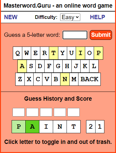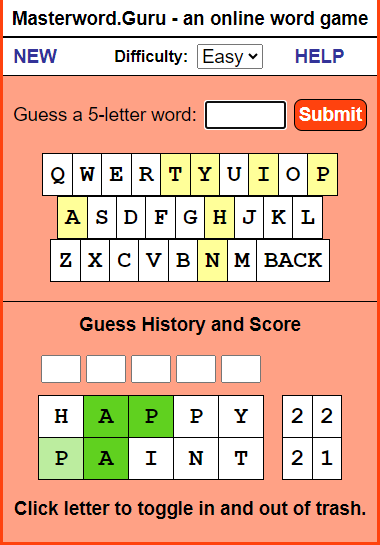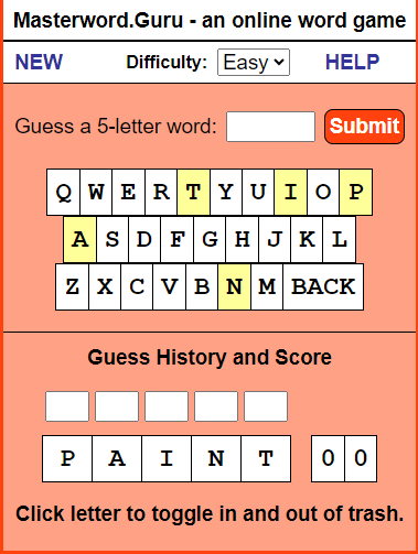 INTRO: Why is this here? I've heard of this Wordle craze. So I checked it out, and it turns out that I invented it. ![]() Sort of... you see, back in the days of shareware, my first app that I ever wrote was called Masterword. It was based on a 5-letter word game that my wife and I would play together on paper in the 80's. I released it on AOL and then later on a website I called fivedollarsoftware, where I put little apps that I'd written. The app was popular and got a few thousand downloads. Later, I created an online version in the mid 2000's... If you ever played the game MasterMind game with colors, mine was with 5-letter words. Hence, MasterWord. I spent a summer vacation as car passenger reading through the American Heritage dictionary for every five letter word to populate the game, and then sorted the words by difficulty. (I'm persistently geeky like that.) I'm not claiming infringement or anything. I just find it interesting that someone has done a version of it that now has taken the world by storm. You may not like the NYT, but since they own it, they use the game to promote the rest of their business. You go there not because you want to read the NYT, but because you want to play the game. The HELP Part MasterWord is a guessing game with words; you use five-letter words to guess the computer's five-letter word. The computer has a library of nearly 4,000 words and chooses one of these words when it loads, so you're ready to begin right away. You enter your word and the computer responds by telling you how many letters you have correctly guessed and, of those, how many are in the right place. Keep guessing until you can deduce enough about the computer's word to correctly guess it. Entering Words You start by choosing a 5-letter word and entering it into the box and pressing Submit. ![]() In this example, we enter 'paint'. ![]() The letters we enter light up in a light yellow so that we can see what letters have been entered so far. You can either use the keyboard-like keys on the screen or use your own keyboard to enter your guess into the box. The words you guess are displayed in the lower History section. Beside each word, you can see the number of letters you got right in the computer's word and, of those, how many are in the right position. A score of 0 0 means that none of the letters are in the computer's word. ![]() A score of 2 1 means that two of the letters are in the computer's word, and one of those letters is in the right position. ![]() So you keep guessing five-letter words - in the case below, 'happy'. That returns a score of 2 2, meaning that the A and the P are correct and in the right position. ![]() As you play games, you'll become more accustomed to guessing the words based on the clues given to you. ![]() One of the tools you will want to use is the ability to blockout a letter and throw it away, so to speak. You do that by clicking on the letter in the History section, which will turn the letter black. ![]() You can also use the five boxes above the History to play around with the letters and see what works. This helps you to visualize the right answer. Once you correctly guess the computer's word, it will tell you and give you the option to play again - and you can choose to use normal everyday words, or more challenging words. ![]() Lastly, you can choose to change the difficulty of the game by changing from Easy to Hard. If you play in the Hard mode, the letters will not light up in green. Instead, you have to use pure logic to determine which letters are correct and in the right place. But in the middle of a game, you can switch between Easy and Hard if you need a hint. | ||||